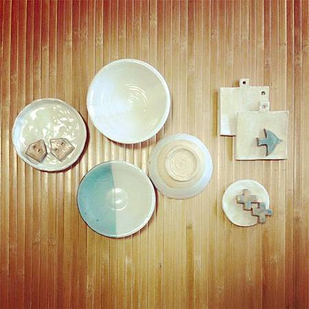 雙色小盤子是第一次拉胚作品,上釉後呈現色澤很飽和&協調。全系列用白色真是正確的決定,因為深色釉太難駕馭了!加上自己對白色器皿有難以言喻的偏執,哇哈哈(手拉胚只有中間三枚/其他是自己試作的小物們)。